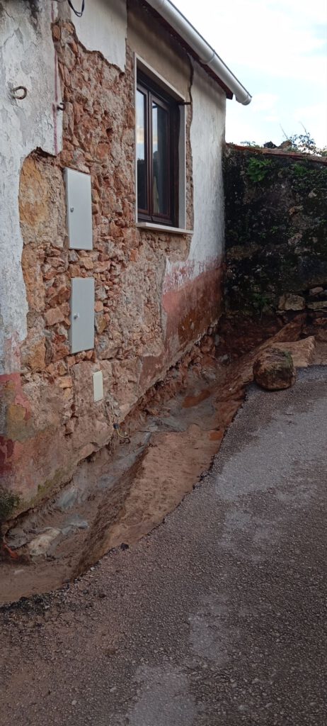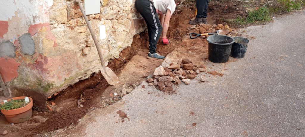 We graven alle grond weg tot op de rots. Dat blijkt zelfs nog minder diep te zijn dan het eerste stuk dat Tim leeg schepte. We gaan er even over nadenken hoe we dit het handigst kunnen doen. Eigenlijk lijkt het erop dat er al niet heel veel water via deze kant naar binnen kan lopen.