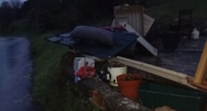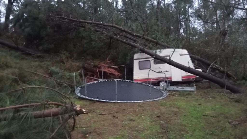 Ik loop weer naar beneden en zie dat er een boom bovenop mijn kleine caravan ligt. Er liggen drie grote dennenbomen om. Ik loop verder naar beneden en de buurman van achter ons staat ontdaan tegen Tim te ratelen. Hij heeft ook veel schade aan zijn daken.