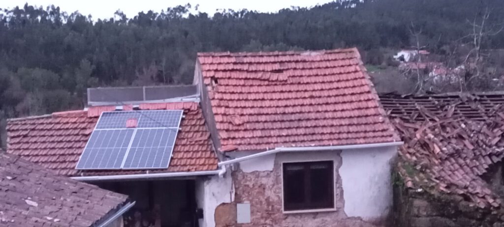 Na het filmen loop ik door naar boven om te zien hoe het met de buurvrouw boven is. Ik kan haar niet rond haar huis vinden, maar haar huis zelf ziet er goed uit. Er is een schuurtje weggewaaid, maar de rest lijkt oke. Ik ga bij de camper kijken en die staat er gelukkig ook nog goed bij. Terwijl ik daar sta, zie ik de buurvrouw uit het bos komen. Ehhh wat doet ze in het bos. Ze is ontdaan en zegt heel veel, pffff, dat kak Portugees. Ik snap er geen zak van. Maar ze gaat gelukkig rustiger praten. Haar huis is in orde. Ik leg uit dat onze daken kapot zijn. We moeten aan de slag. Ze haalt haar mobiel uit haar zak en ze vindt het heel erg dat haar batterij bijna leeg is. We hebben geen idee hoelang we zonder stroom blijven. Ik leg haar uit dat wij nog een volle batterij hebben en dat wij haar telefoon op kunnen laden. Ze zegt dat ze straks zal komen.