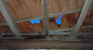 Als we zeker weten dat iedereen verder in orde is, gaan we aan de slag. Het is mooi weer en we willen de daken zo snel mogelijk weer dicht hebben. Eerst maak ik foto’s van alle schade.